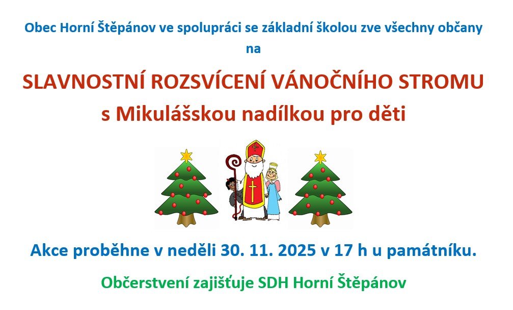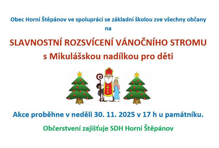 Obec Horní Štěpánov ve spolupráci se základní školou zve všechny občany na SLAVNOSTNÍ ROZSVÍCENÍ VÁNOČNÍHO STROMU s Mikulášskou nadílkou pro děti.
