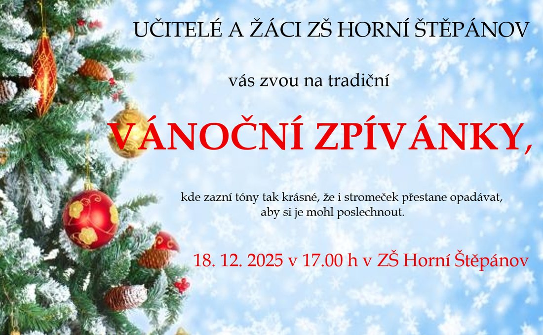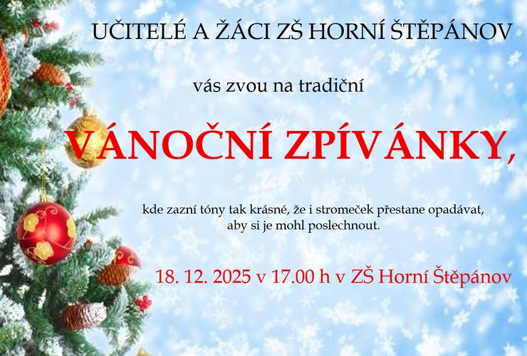 Učitelé a žáci zvou na tradiční Vánoční zpívánky ve čtvrtek 18. prosince od 17 hodin v ZŠ Horní Štěpánov. Zazní tóny tak krásné, že i stromeček přestane opadávat, aby si je mohl poslechnout